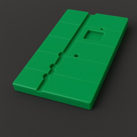 Rohware auf 17,8 mm geschlichtet , 4 querverlaufende 0,4 mm tiefe V-Nuten, Mittelnut 12 mm breit und 4 mm tief , Bohrungen und Tasche nach DXF-Datei produziert .
